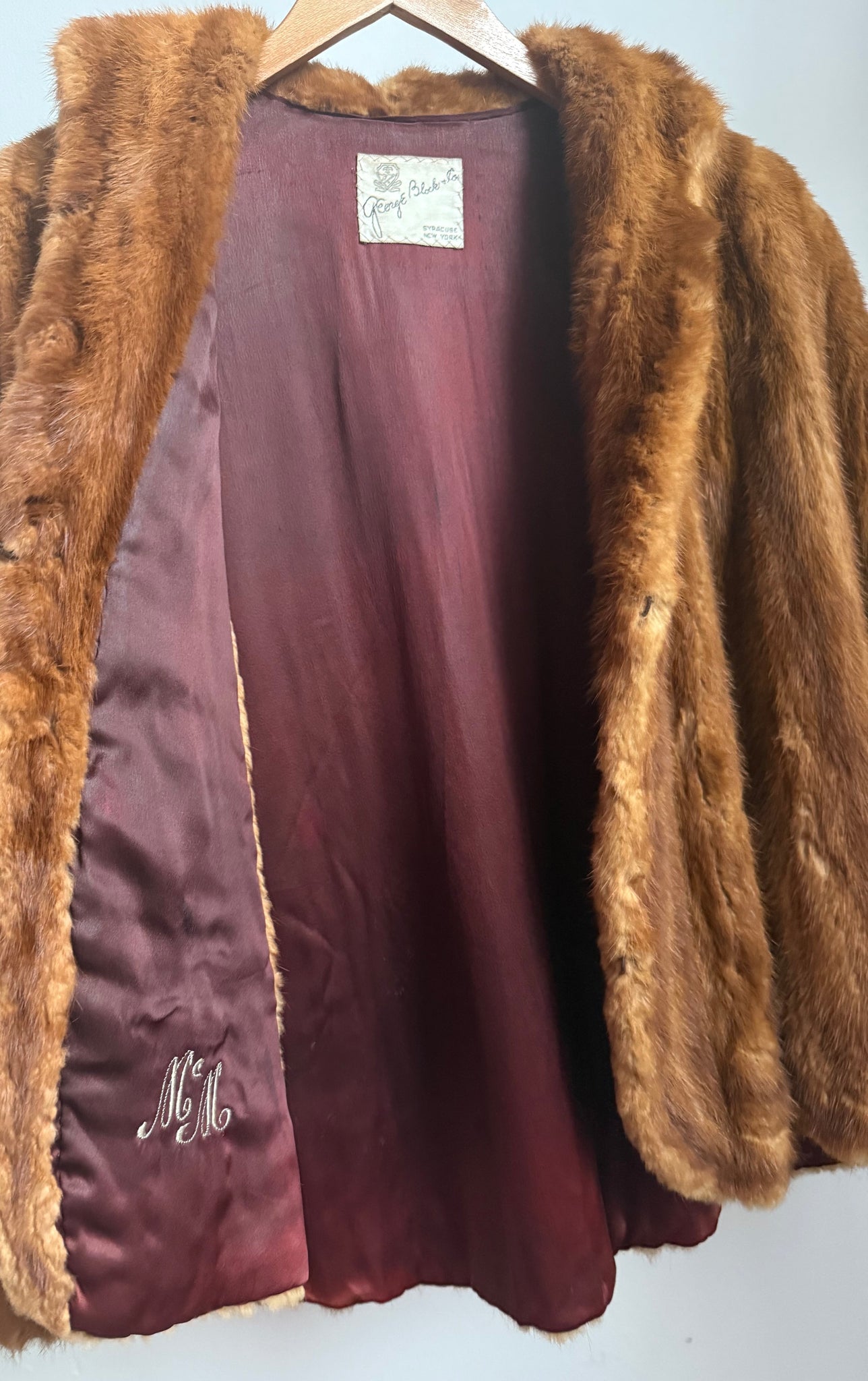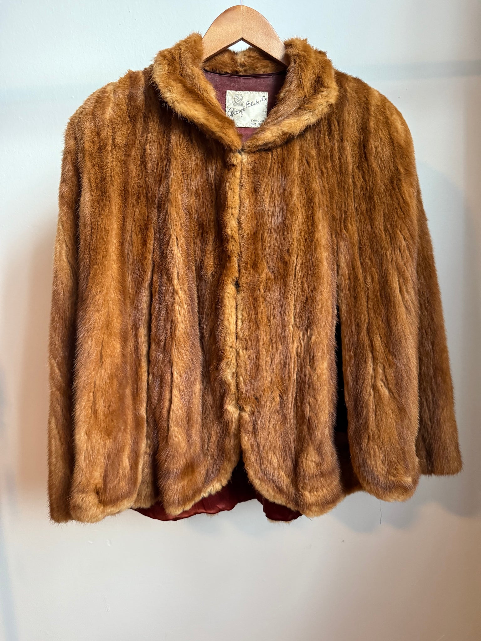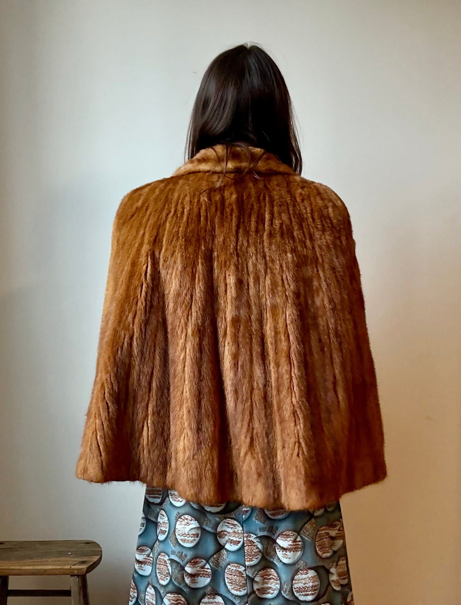 DETAILS: 1940's - 1950's Genuine Mink fur coat cape. Color is a golden honey / demi buff mink. Lined with what is most likely a rayon satin. This coat features a mid century swing silhouette with rounded shoulders, a plush collar, and a beautifully draped A-line fit. Hand sewn interior labels. Elegant, soft, warm, and beautifully made. Fur is soft and glossy, no shedding or bald spots and well preserved for its age.