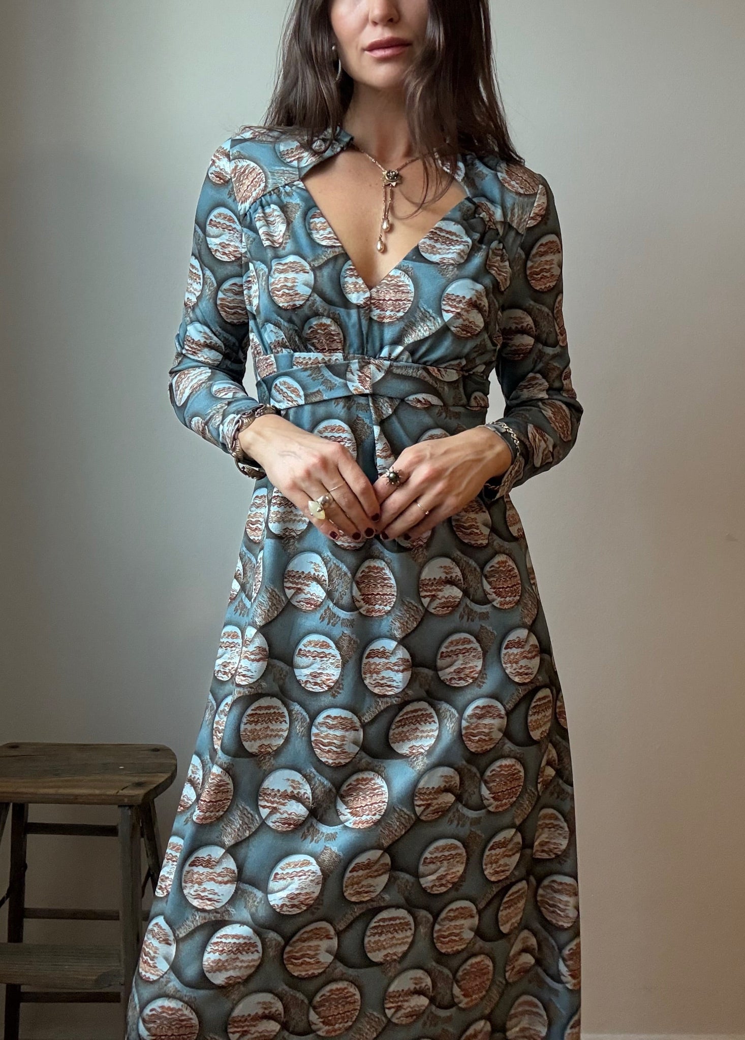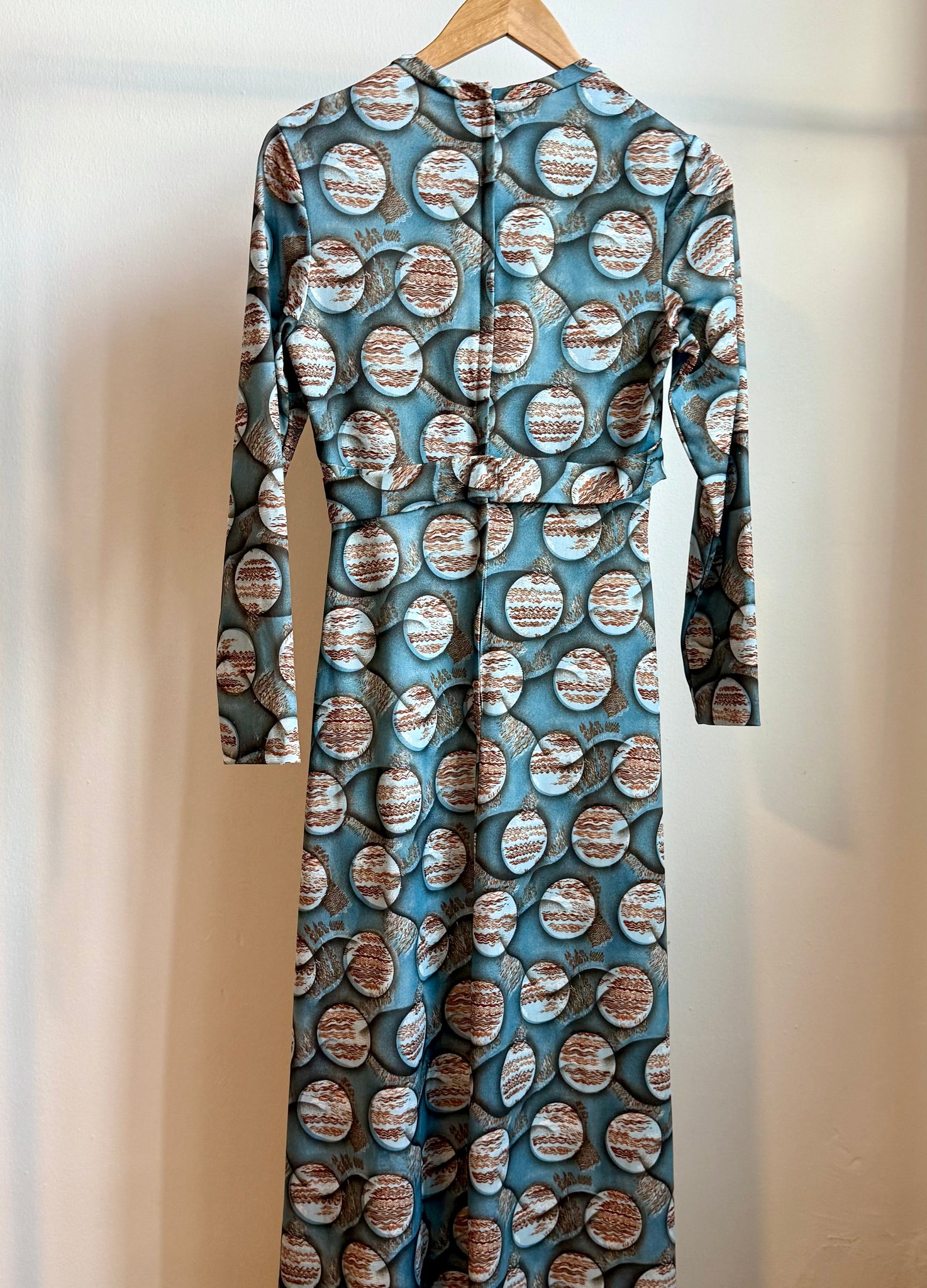 Stunning late-60s/early-70s Op Art printed maxi dress featuring a soft blue and copper circular illusion pattern. Designed with a flattering empire waist, long sleeves, and a keyhole V-neckline. Lightweight and flowy with beautiful drape. A rare, space-age inspired statement piece