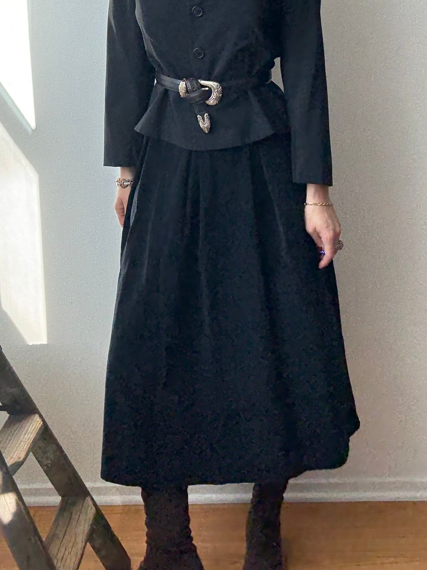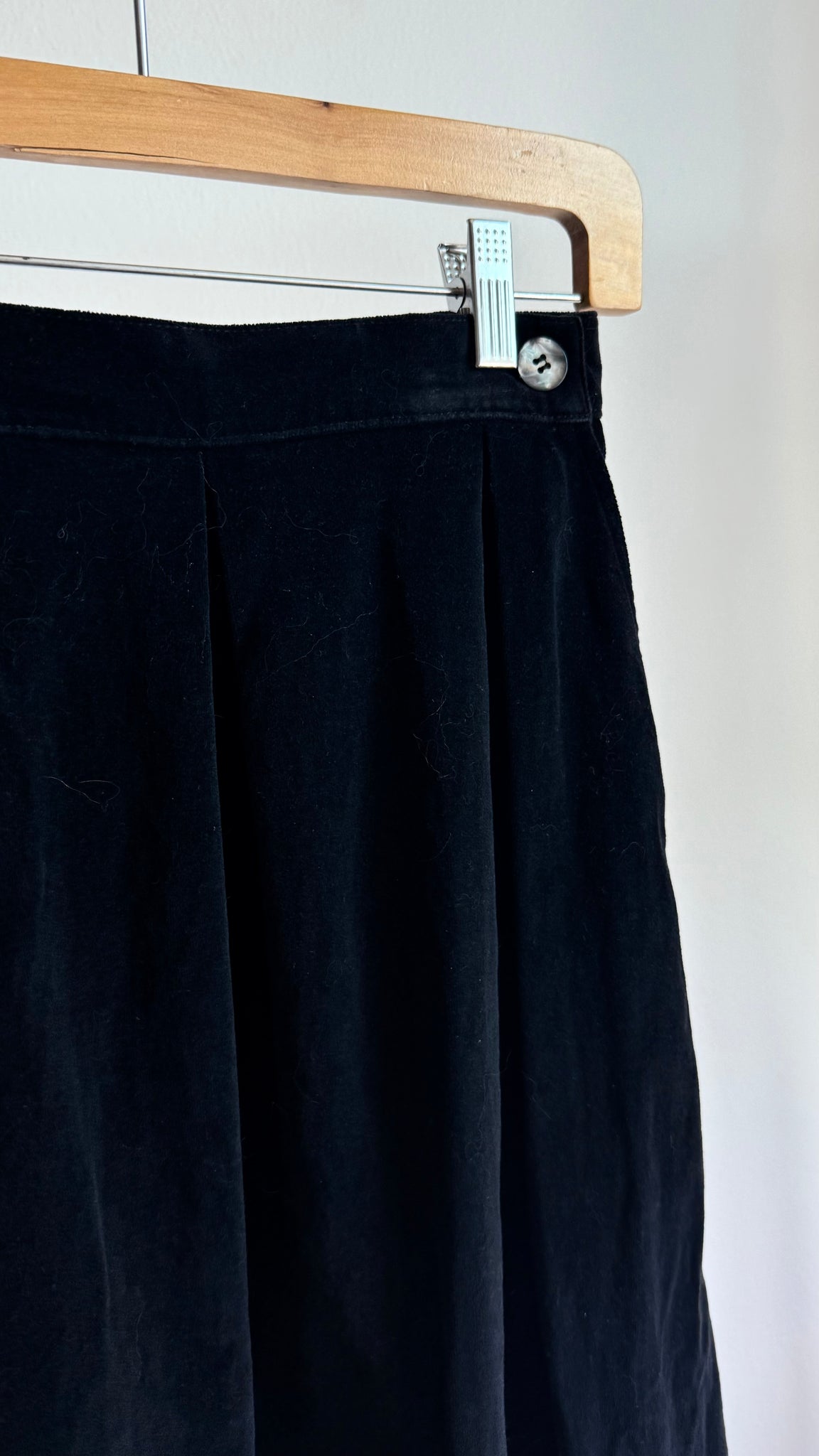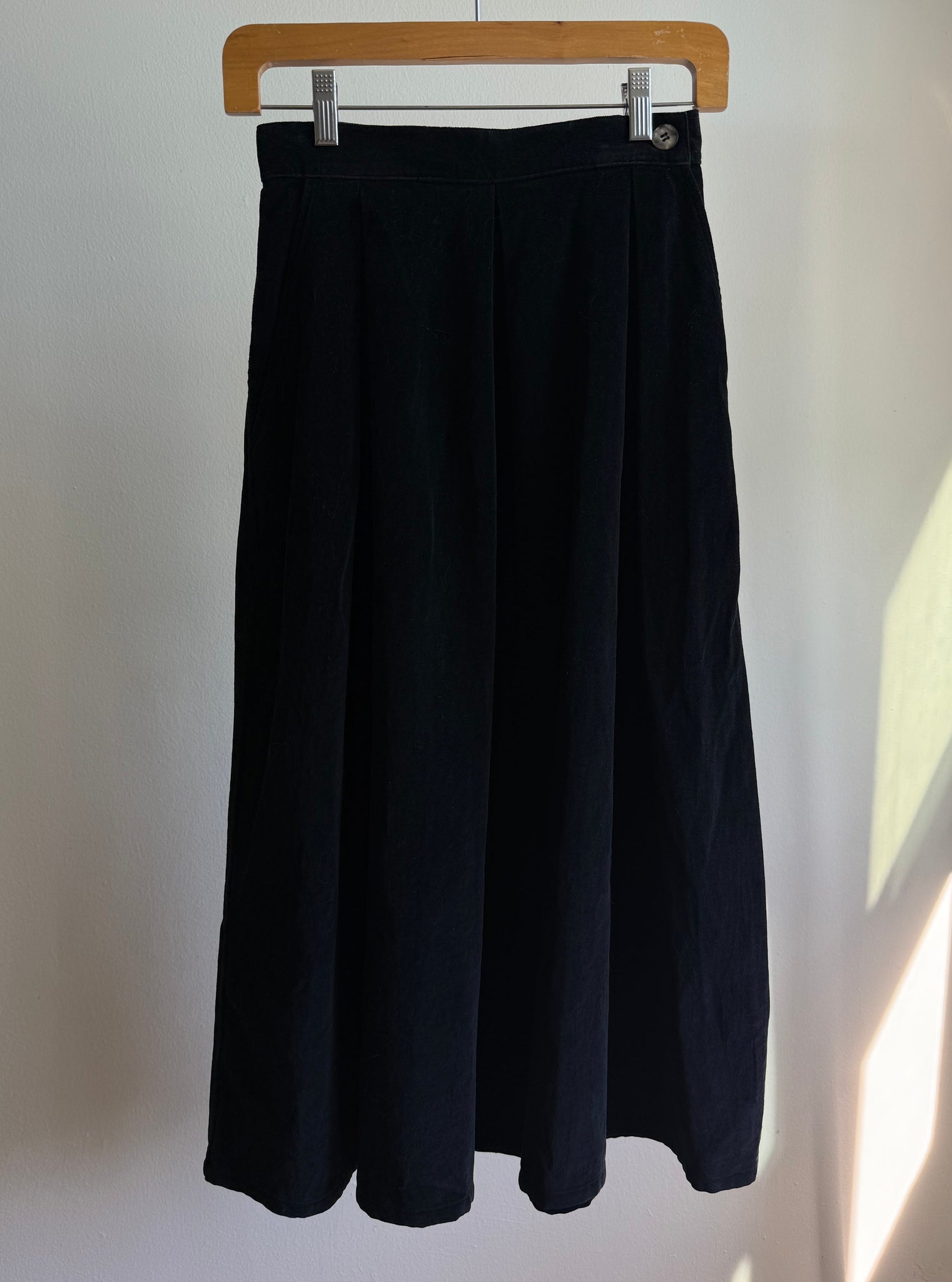 DETAILS: Sophisticated, minimalist skirt appears to be velveteen or corded cotton, a heavier textile popular for fall/winter designer skirts in the late 1970s. Structured waistband with side button closure and soft front pleats. A-line midi length (mid-calf). Pockets!! This skirt is in excellent condition.