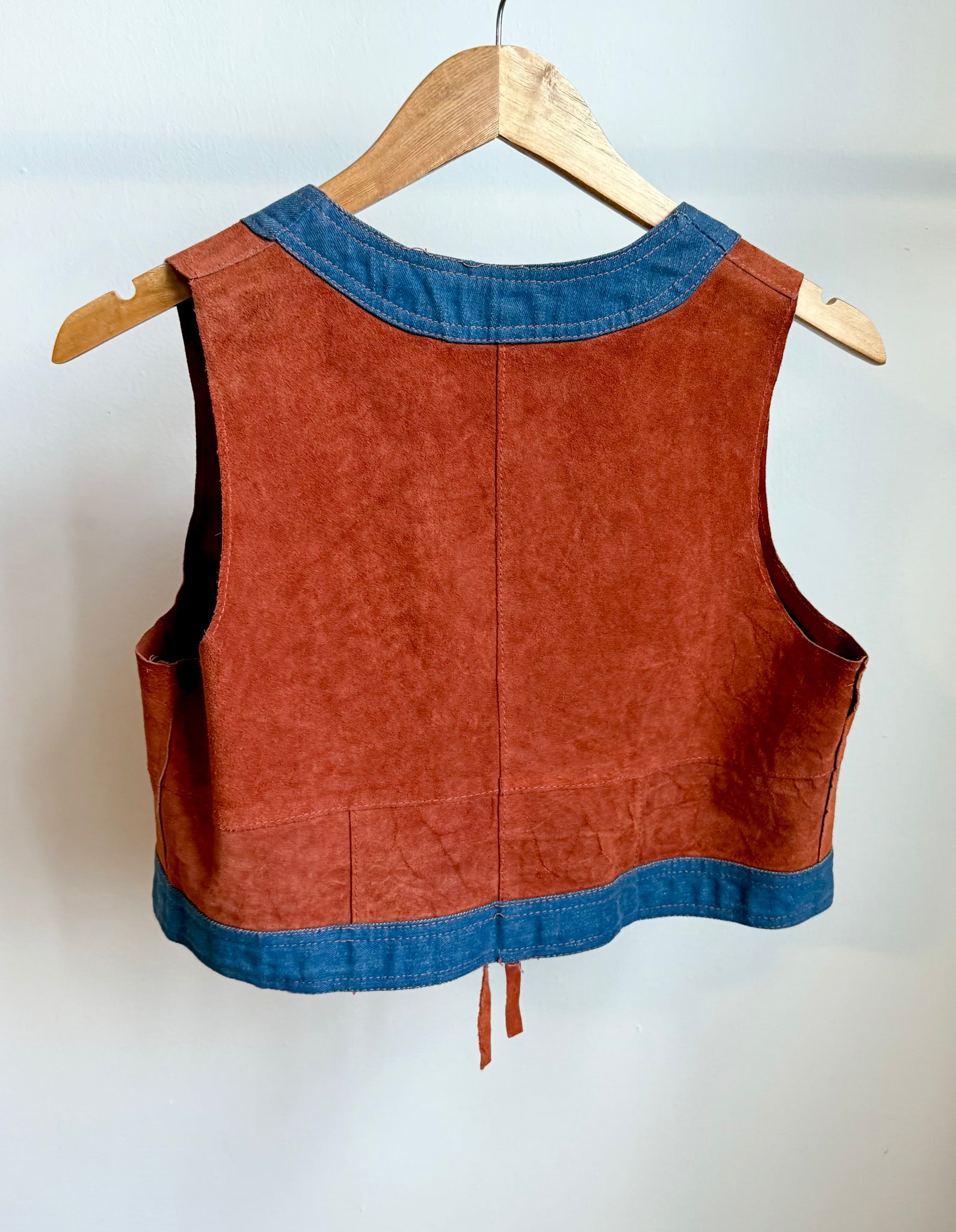 Authentic 70s boho-western vest in rich rust suede with contrast denim trim and a lace-up front. Handmade-style stitching, soft genuine leather, and classic festival-era detailing. A stunning statement layer that pairs perfectly with dresses, tees, or high-rise denim. A rare, beautifully made vintage leather piece.
