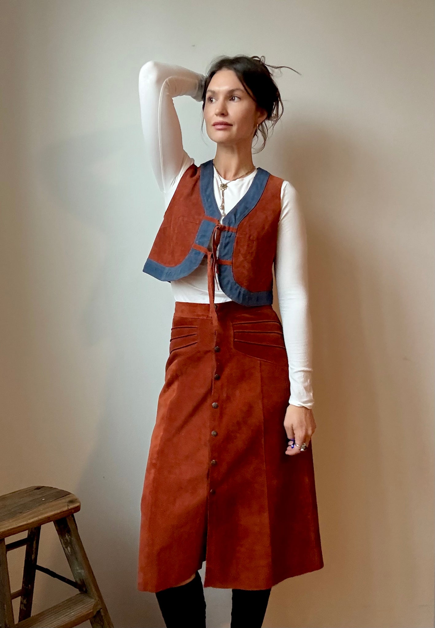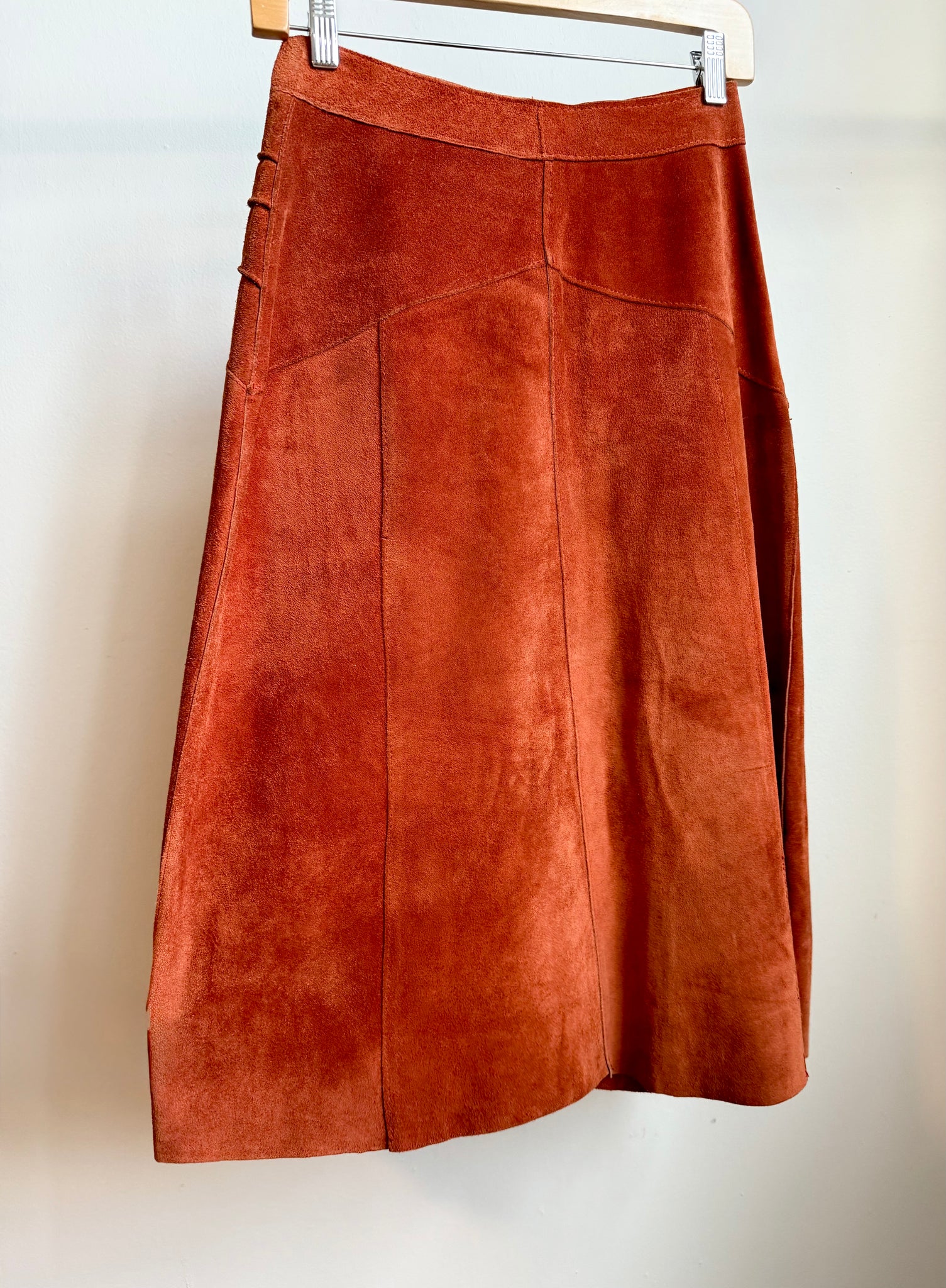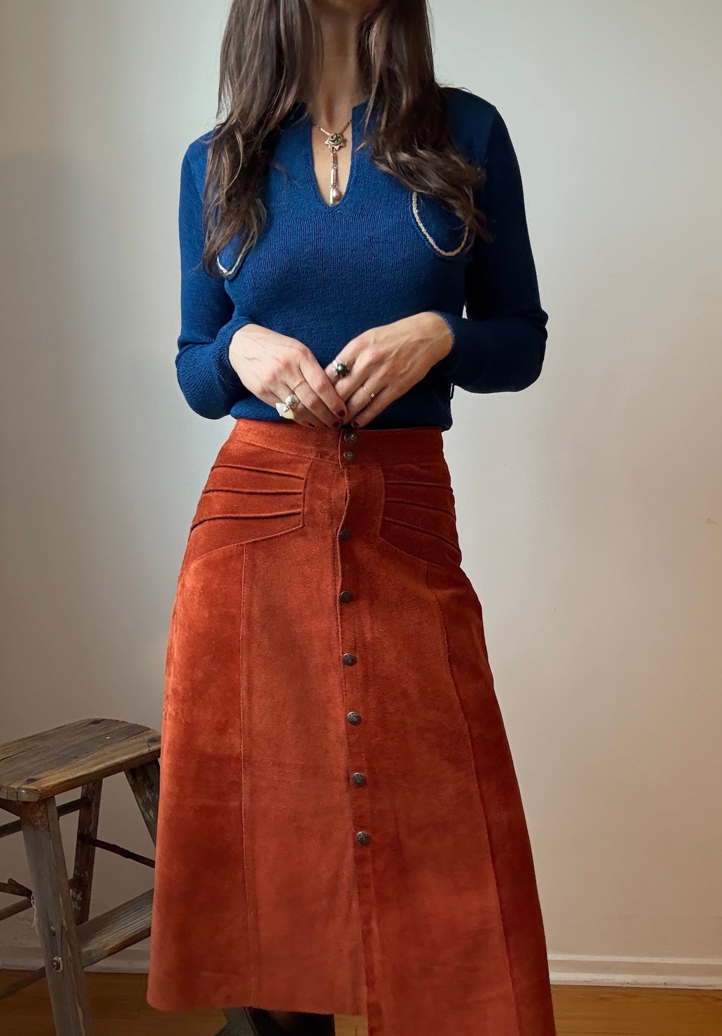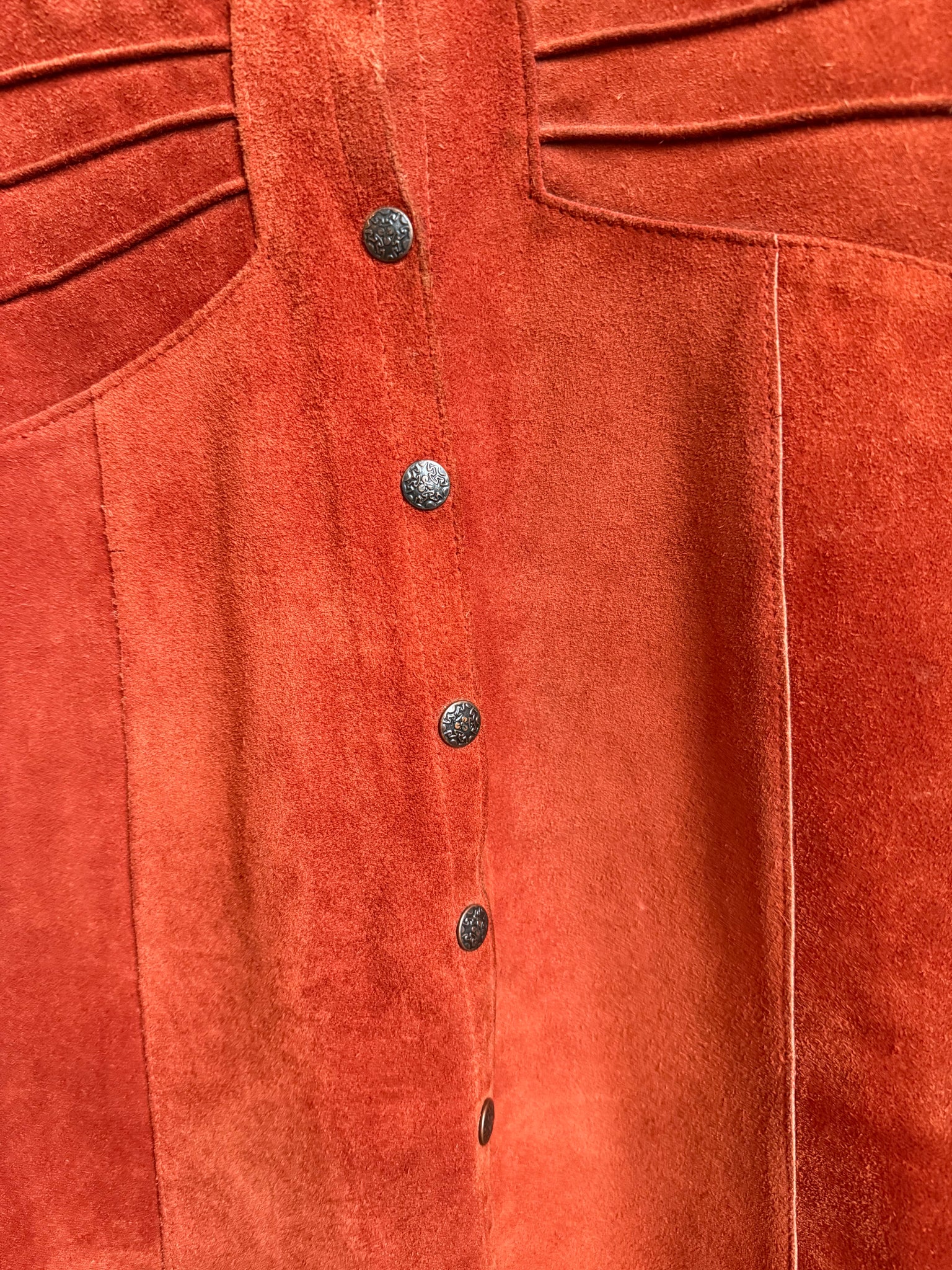 Beautiful true 70s suede skirt in a rich terracotta tone, featuring antique brass snap buttons, stitched pleat detailing at the waist, and a flattering A-line silhouette. Made in Argentina from soft genuine suede with classic Western–boho styling. A stunning statement piece that pairs perfectly with knits, boots, and denim layers.