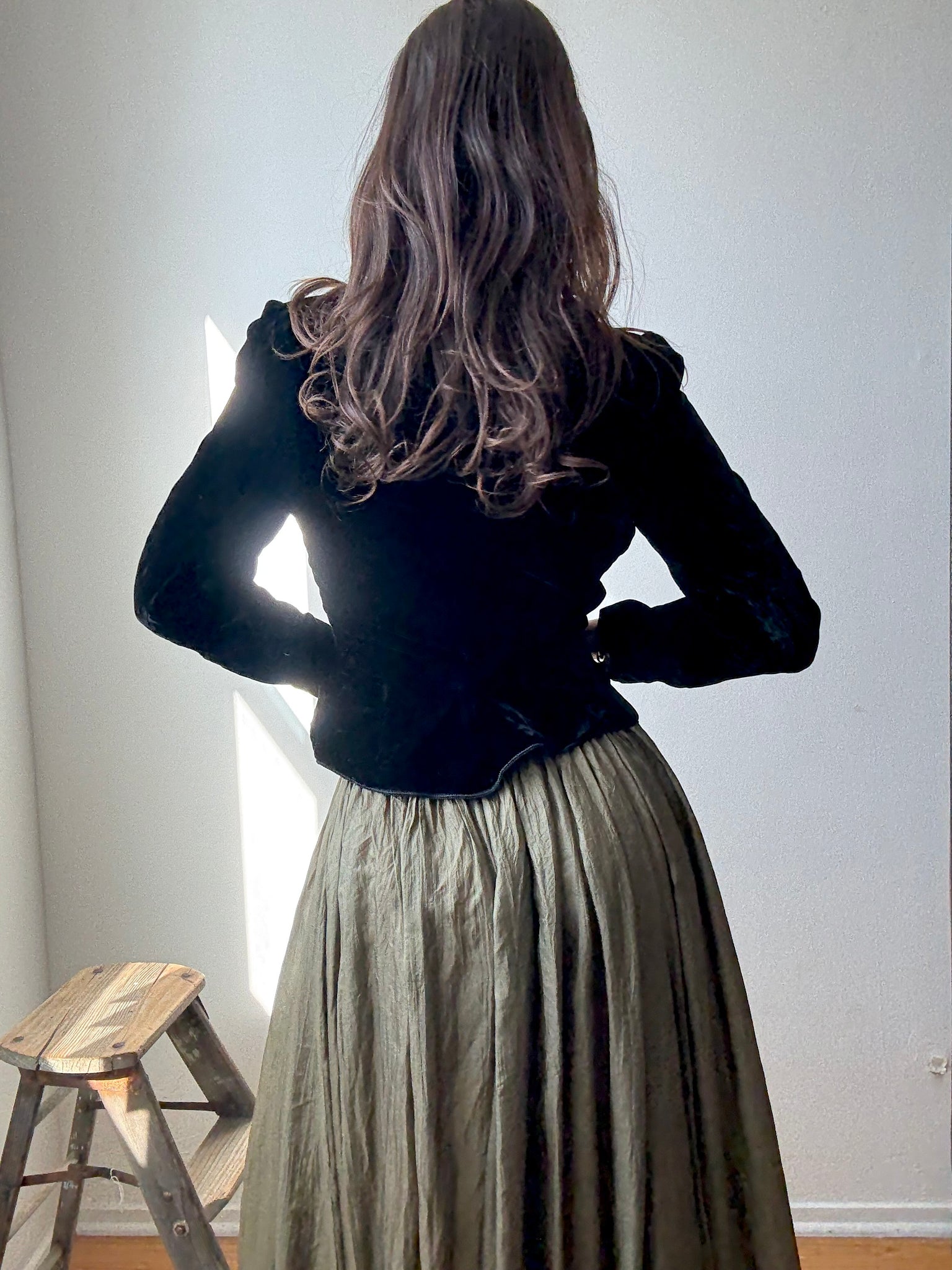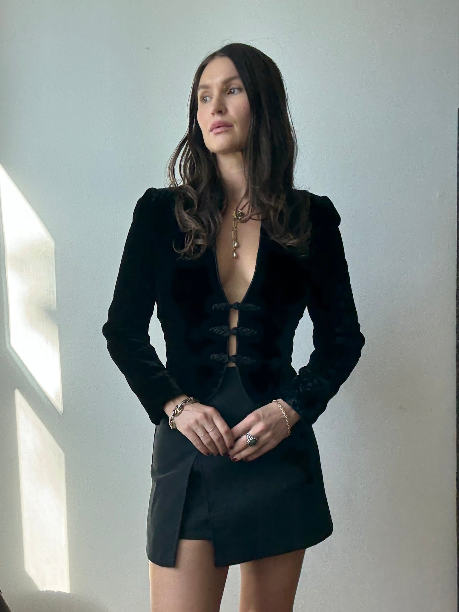 DETAILS: 1990's fitted frog-style button closure top / jacket. Exude timeless elegance in this beautifully tailored vintage blazer. Crafted in rich black velvet, this ladies’ jacket features a deep V-neckline, elegant frog-style button closures, and a fitted waist that gently flares at the hips for a flattering silhouette. The structured shoulders and subtle curves speak to a power-dressing aesthetic, while the luxe velvet and clean interior lining ensure this piece remains highly wearable today. Fully lined and labeled “Dry Clean Only.
