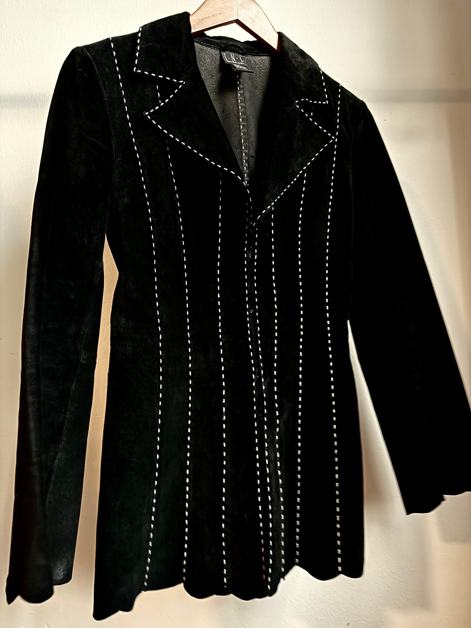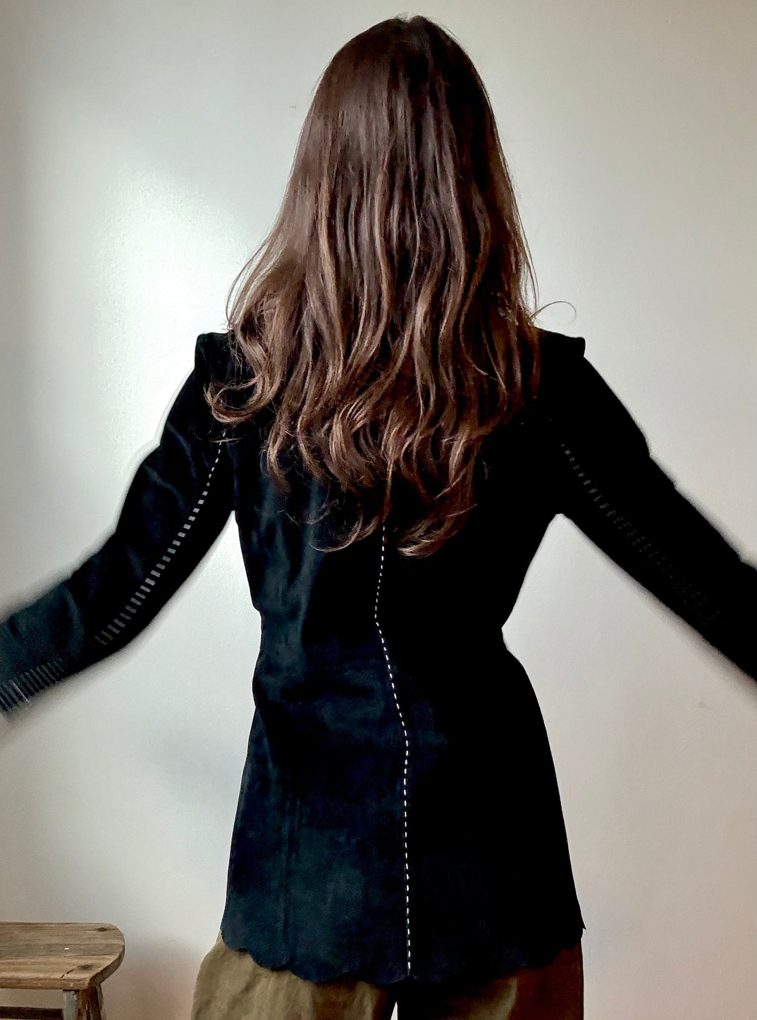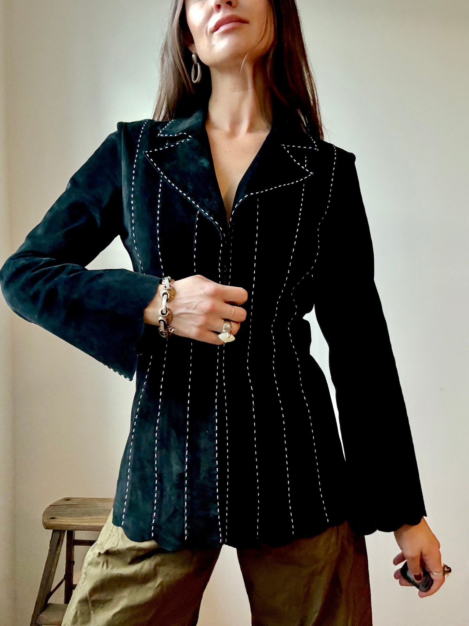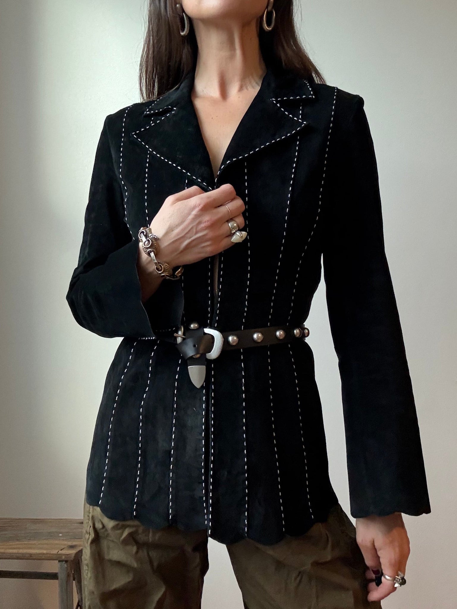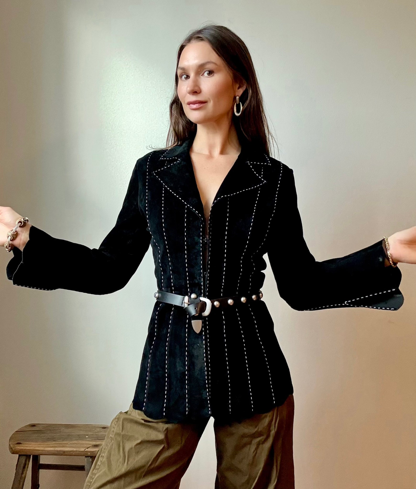 DETAILS: Black Vintage suede leather jacket with bold white contrast stitching and unique bohemian bell sleeves and scalloped detailing along the sleeves and bottom hem. Sturdy front hook closures creating a feminine structured look when worn closed.