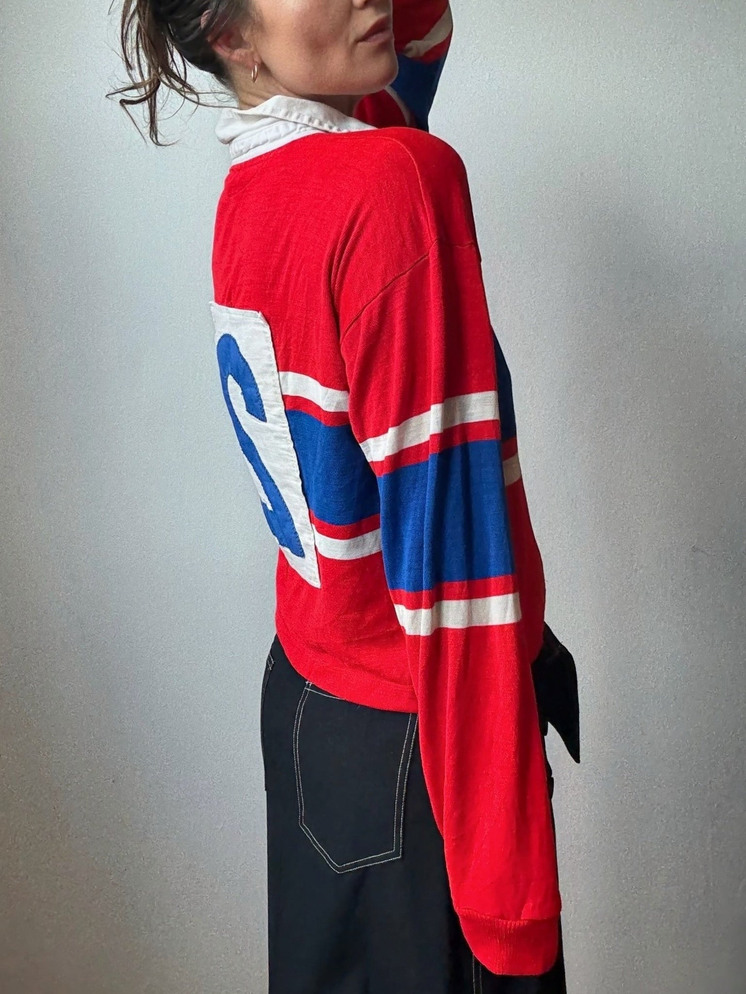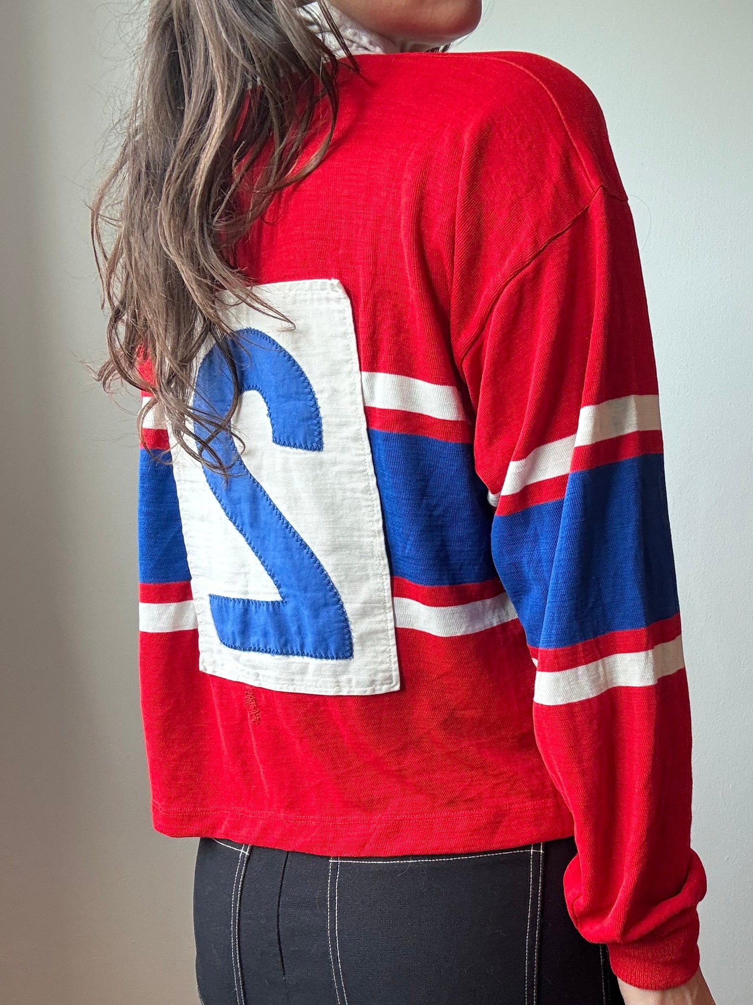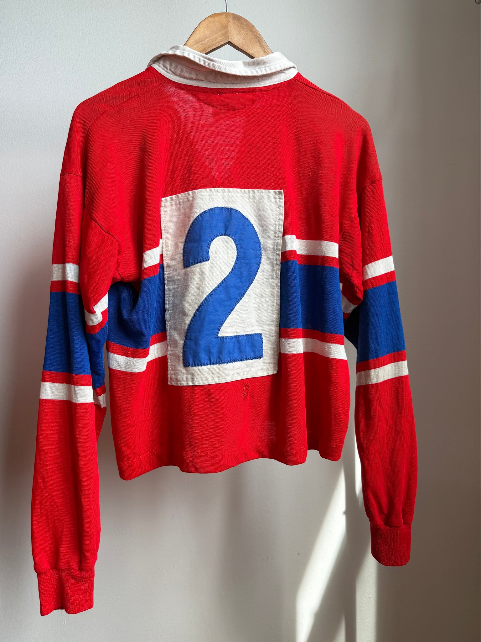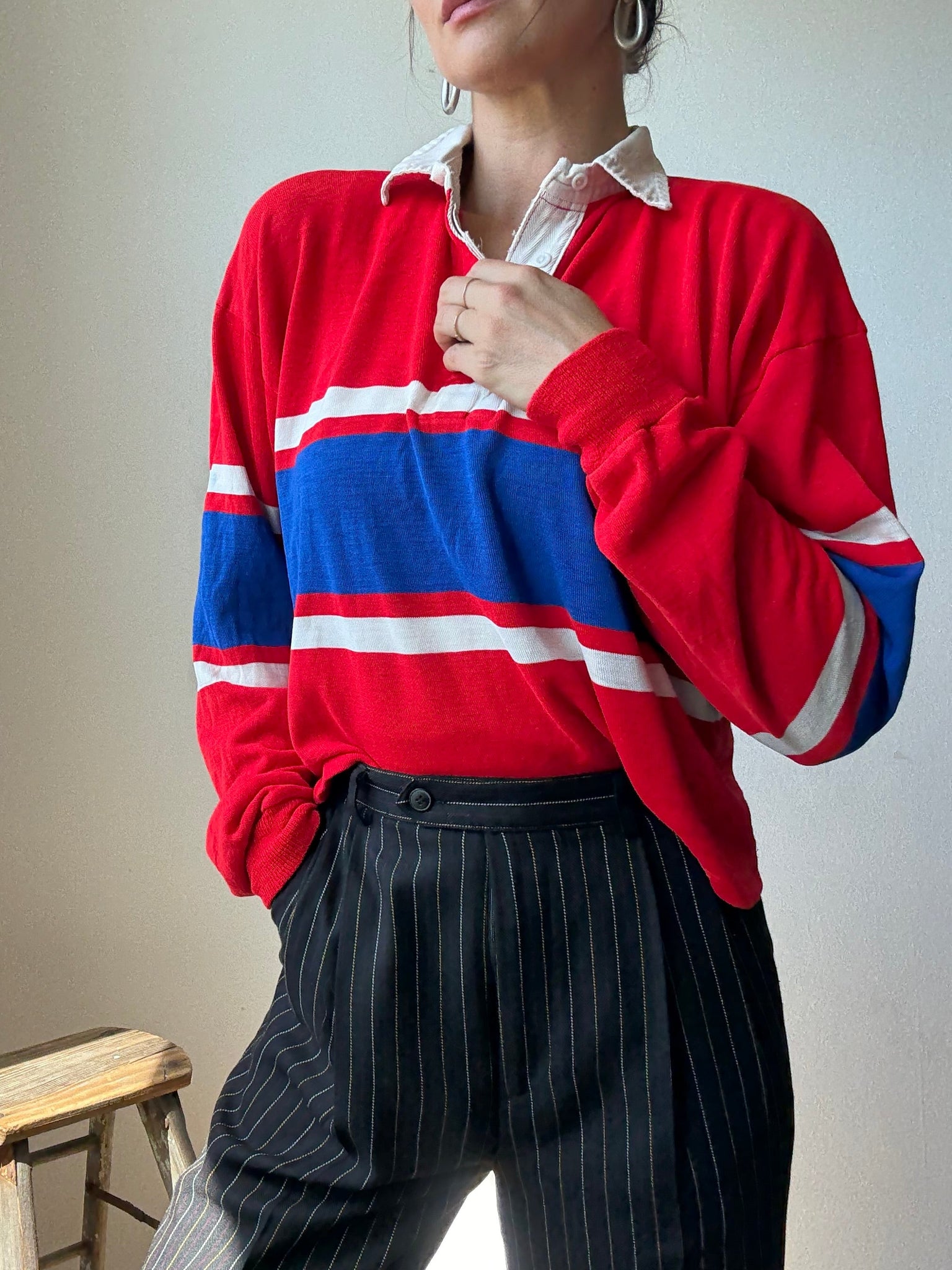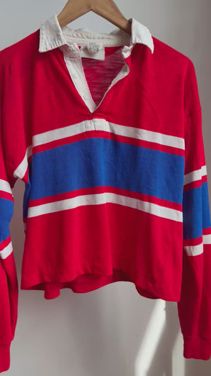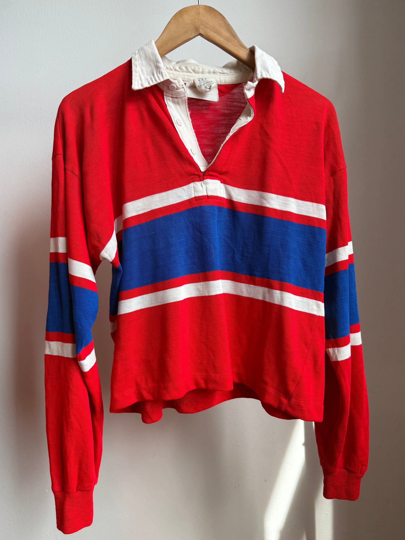 DETAILS: Made in USA. Red, blue, white striped. Vintage sportswear rugby polo longsleeve. Buttons all in tact. Small patchwork detail to holes adding the perfect vintage character - see photos!