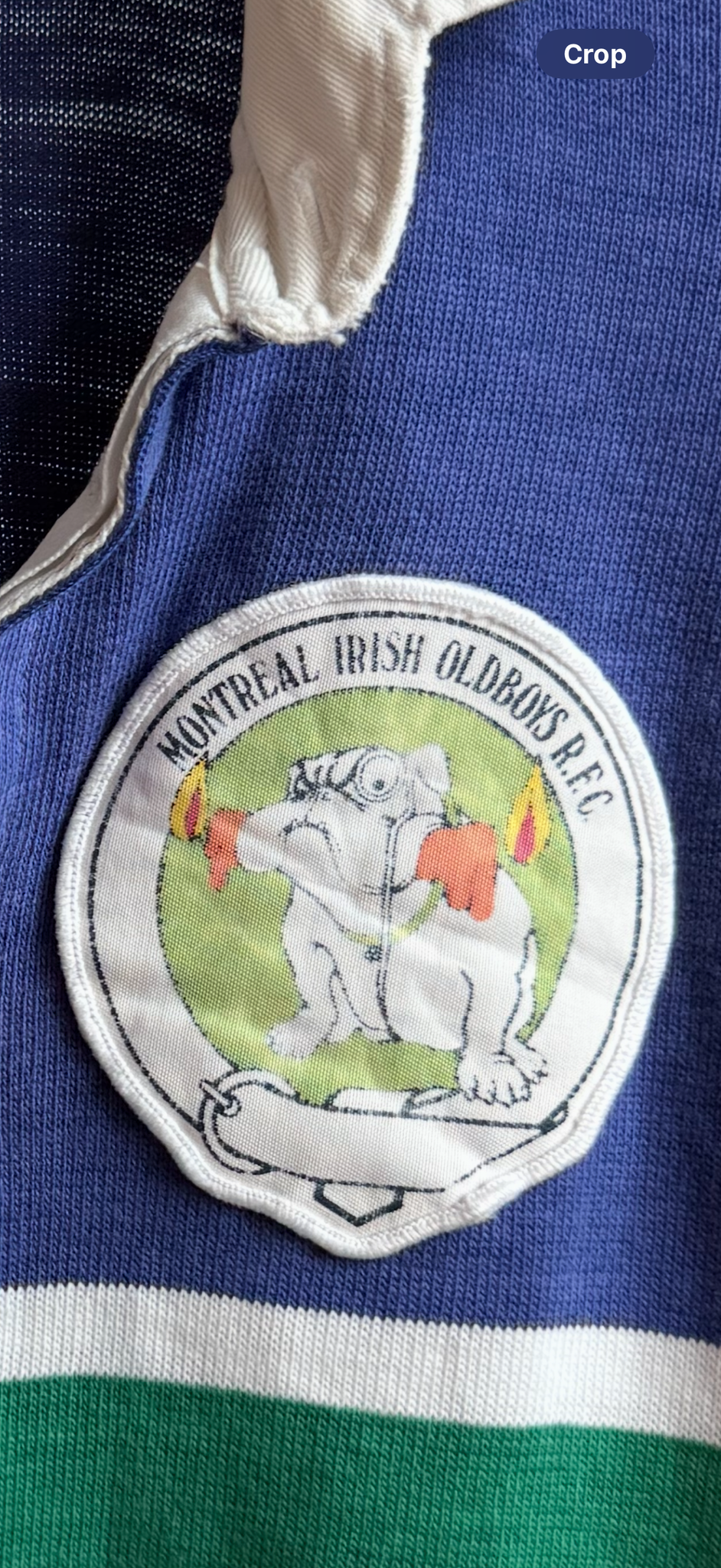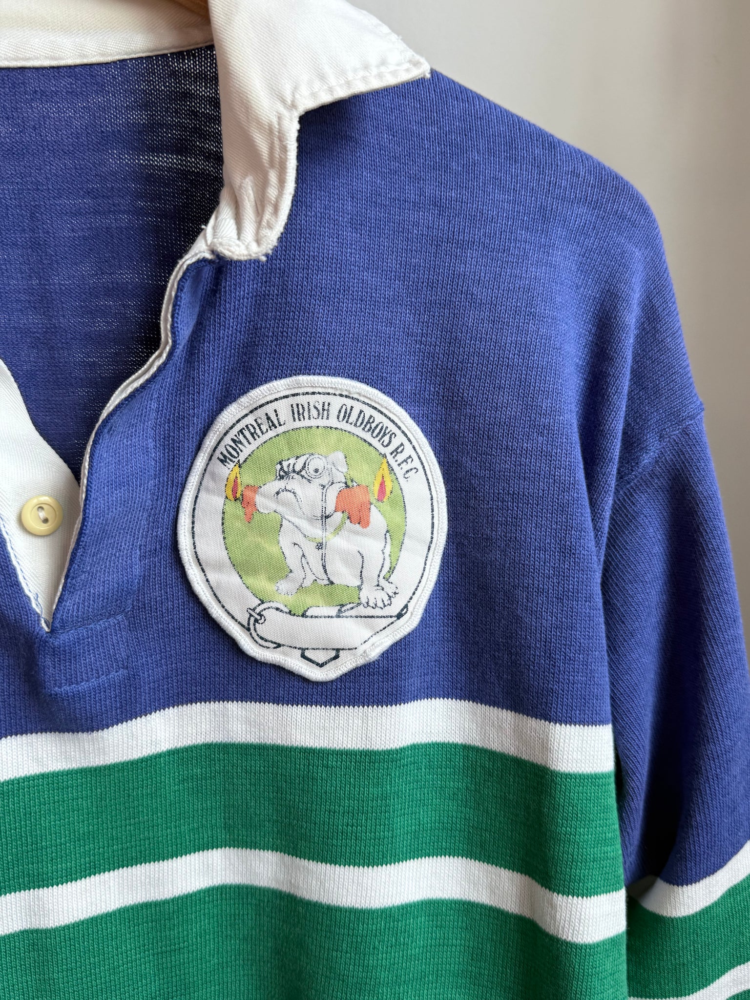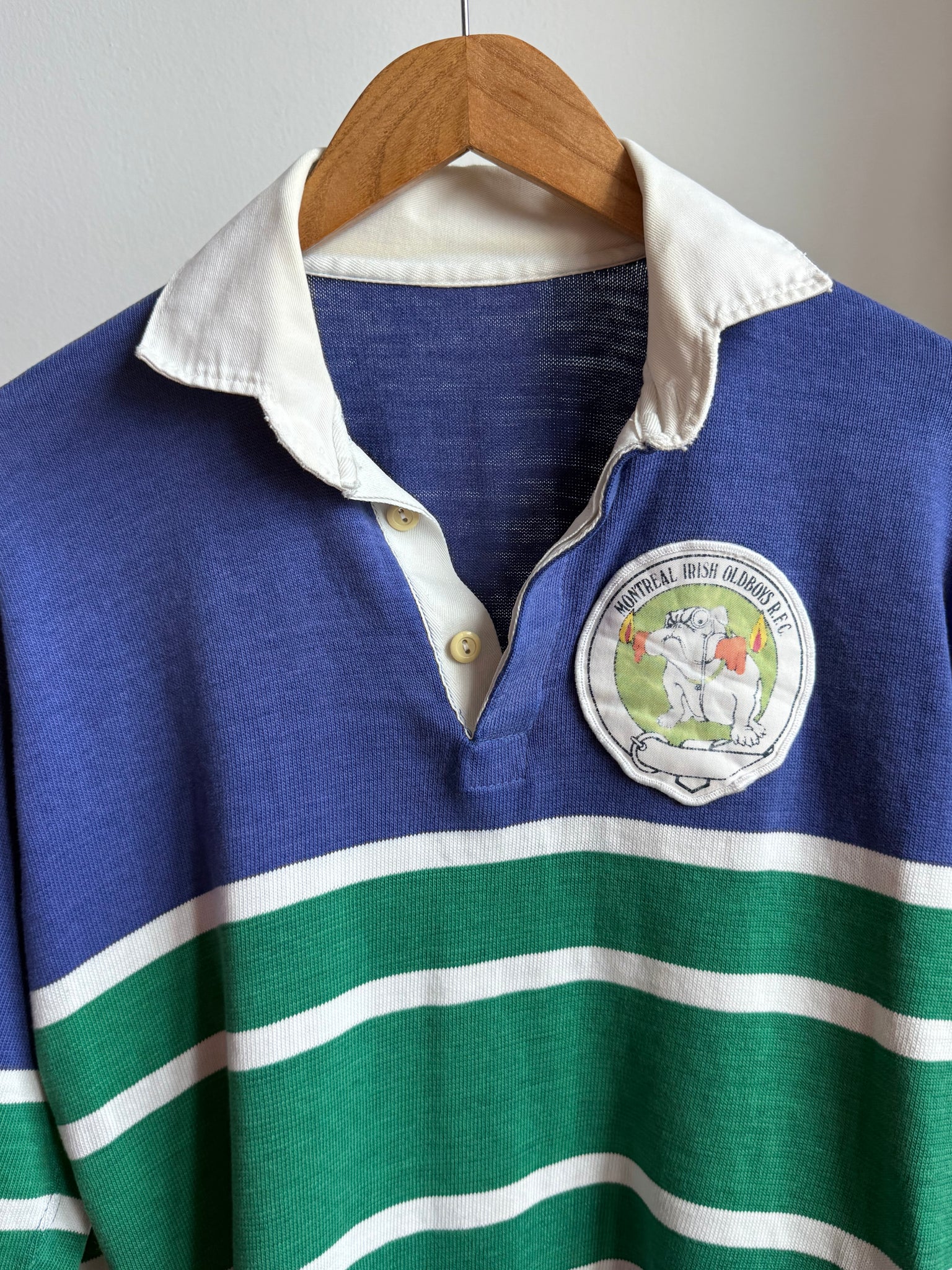 DETAILS: Bright Blue, white, and green striped rugby polo, Great condition.